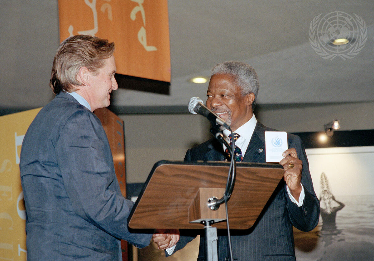 Actor Michael Douglas (left), a United Nations Messenger of Peace, is presented with a children's passport version of the Universal Declaration of Human Rights by Secretary-General Kofi Annan, on the occasion of the fiftieth anniversary of the Universal Declaration of Human Rights.