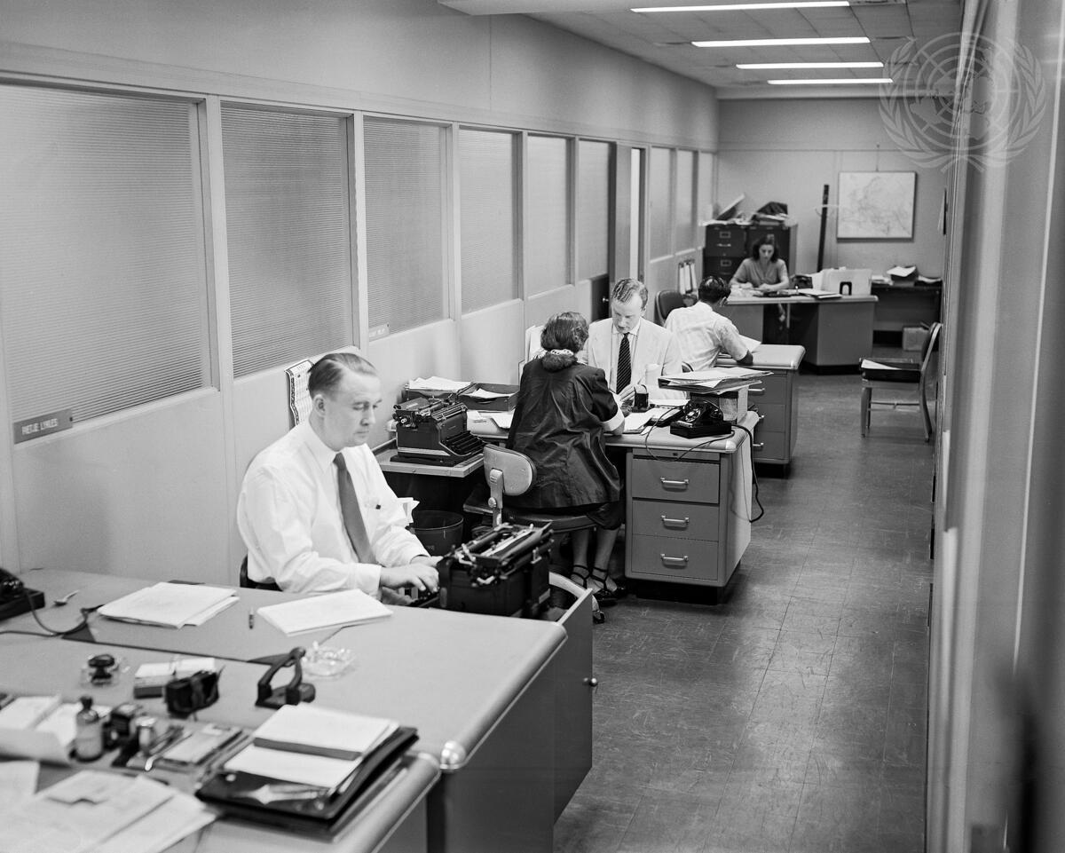 In the United Nations Headquarters Secretariat building, new desks supplied from France, have recently been installed. They are grey to match the office walls, and feature a pullout typewriter stand. An office in the radio sections shows the new desks being used for both typing and other office work.