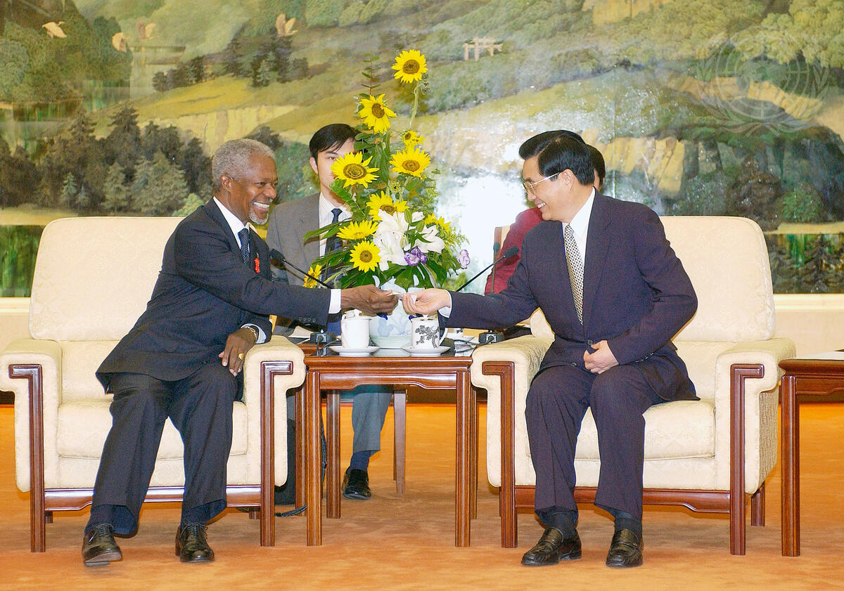 Secretary-General Kofi Annan (left) gives an AIDS pin to Hu Jintao, President of the People's Republic of China, at the Great Hall of the People.