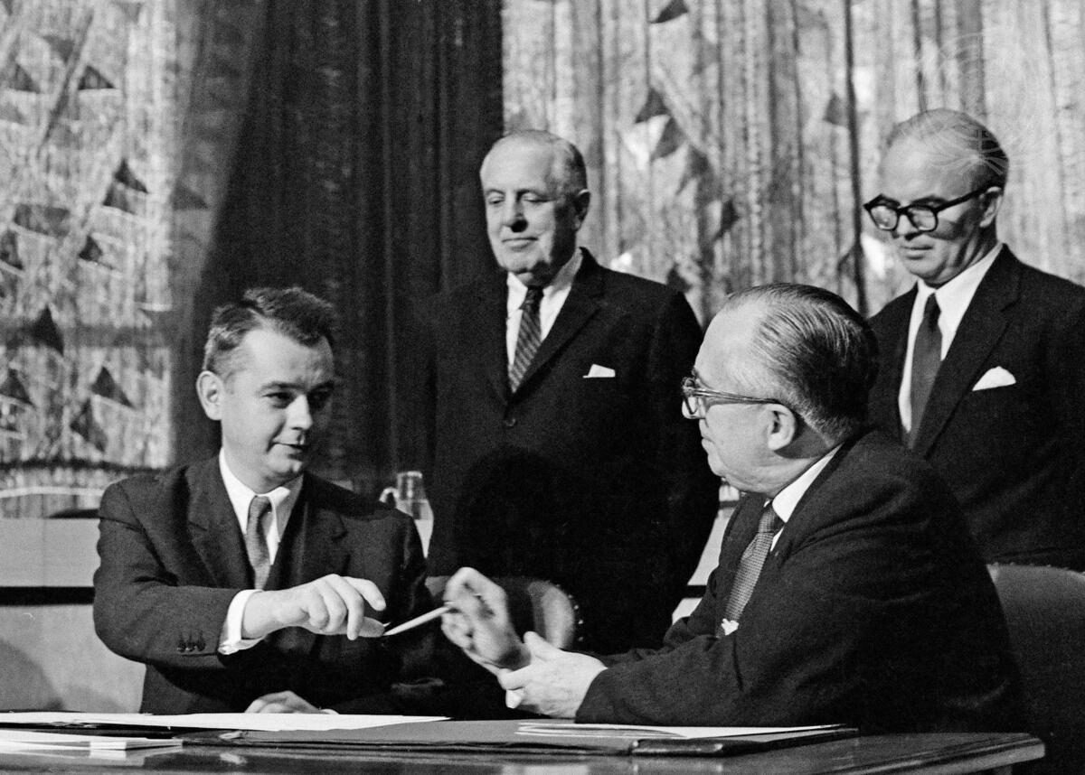 Seen here preparing to sign for his country is Mr. Bohdan LEWANDOWSKI, Poland's Ambassador to the UN. Handing him the pen is the conference president, M. Eurico PENTEADO, of Brazil. Looking on are the Managing Director of the UN Special Fund, Mr. Paul HOFFMAN (left) and the Executive Chairman of the UN Technical Assistance Board, Mr. David OWEN.