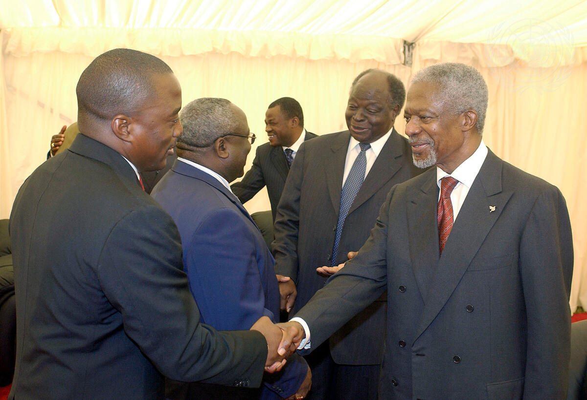 Secretary-General Kofi Annan (right) meets with Joseph Kabila, President of the Democratic Republic of the Congo, before the start of the Conference on Peace, Security, Democracy, and Development in the Great Lakes Region in Dar-es-Salaam, Tanzania.