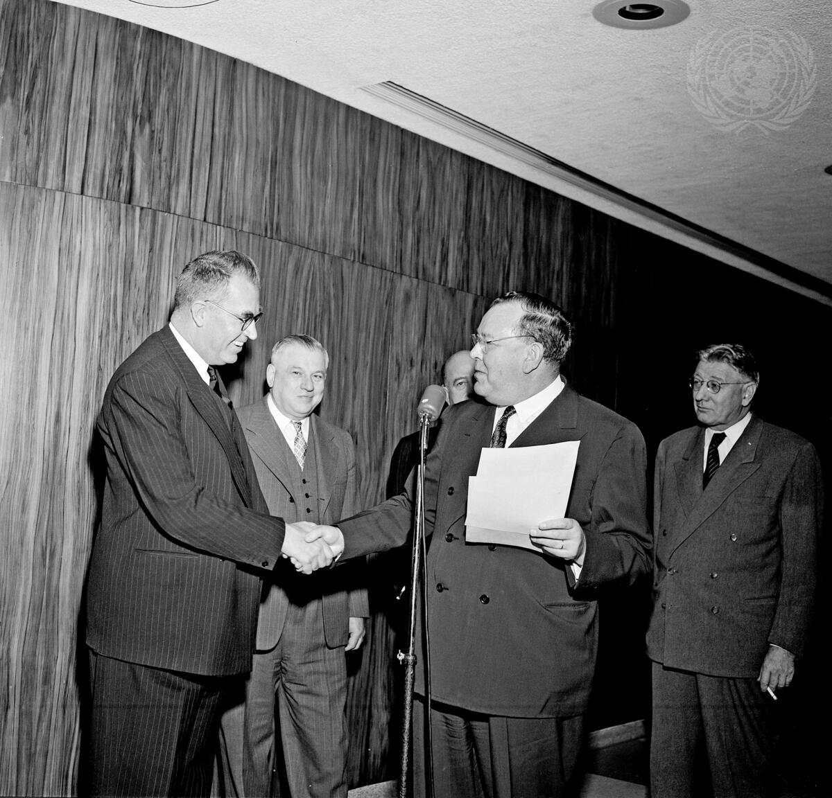 UN Secretary-General Trygve Lie today formally accepted New Zealand's gift for the Headquarters of the United Nations of the Rimu paneling on the first floor of the General Assembly building.This picture, taken during the brief ceremony, shows Secretary-General Trygve LIE (right) shaking hands with Ambassador Leslie Knox Munro, New Zealand's Permanent Representative to the UN. Between the two men is Mr. Andrew Cordier, Executive Assistant to the Secretary-General.