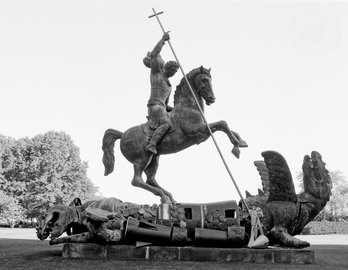 The Soviet Union presented a sculpture to the United Nations on the occasion of the organization's 45th anniversary. Created by Zurab Tsereteli, a native of Georgia, the sculpture titled ""Good Defeats Evil"" is 39 feet high and weighs 40 tons, depicting St. George slaying the dragon. As the dragon is created from fragments of Soviet SS-20 and United States Pershing nuclear missiles that were destroyed under the terms of the Intermediate-Range Nuclear Forces treaty of 1987, it is a vivid symbol of the post-Cold War period.