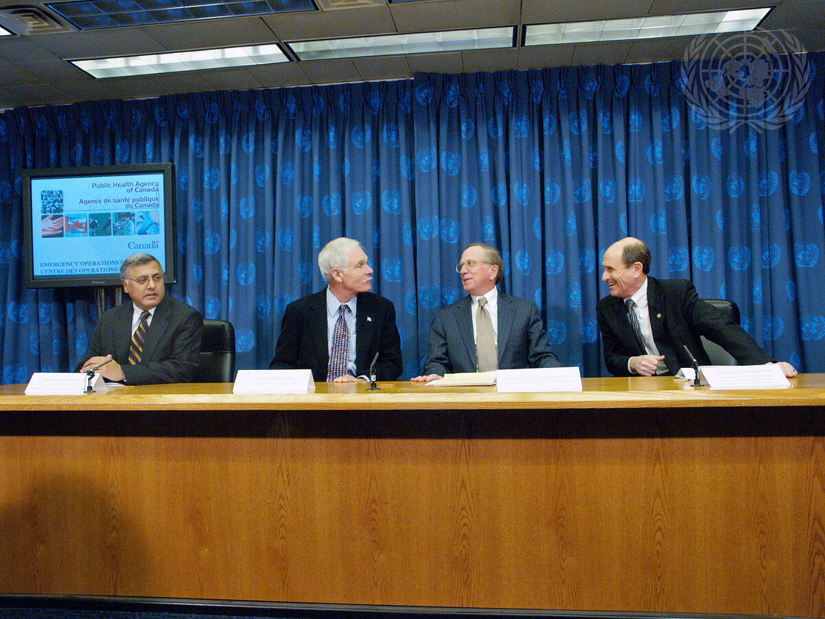 From left to right: Ujjal Dosanjh, Health Minister of Canada, Ted Turner, Co-Chairman of the Nuclear Threat Initiative, Sam Nunn, CEO and Co-Chairman of the Nuclear Threat Initiative, Stephen J. Corber, Area Manager of Disease Prevention and Control for the Pan American Health Organization of the World Health Organization. A press conference was held today on the 'Global Health Intelligence Network II