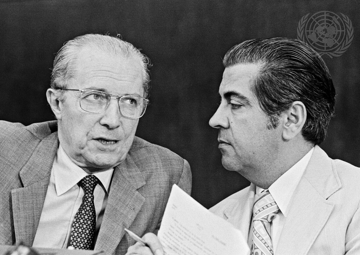 Louis de Guiringaud (left) of France conferring with Aquilino E. Boyd (Panama), President of the Council, before the meeting began.