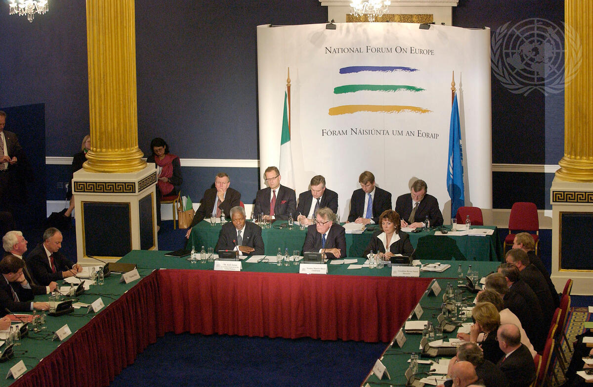 Secretary-General Kofi Annan (centre, left) gives a speech at the National Forum on Europe, held at St. Patrick's Hall in Dublin Castle, on the theme of EU - UN Cooperation in Crisis Management. Maurice Hayes (centre), Chairman of the National Forum on Europe, looks on.