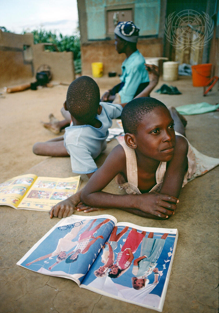 A young girl from Ndebele tribe in South Africa reading a magazine. 1984.