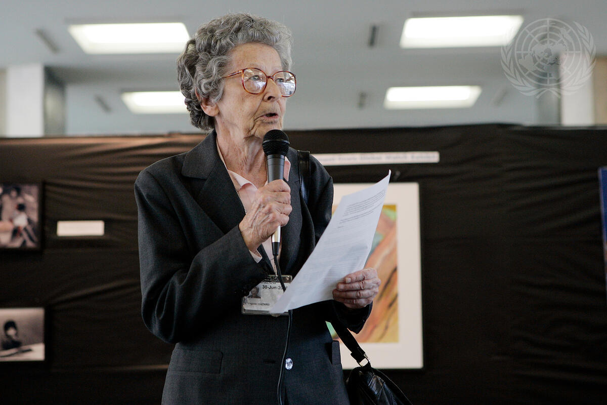 Virginia Hazzard, Representative of the Non-Governmental Committee on Ageing, speaking at today's exhibit opening. A panel discussion of the Millennium Development Goals (MDG) Global Watch as well as a photo exhibit on the theme ""Millennium Development Goals: 4 Years After"" opened today at UN Headquarters.