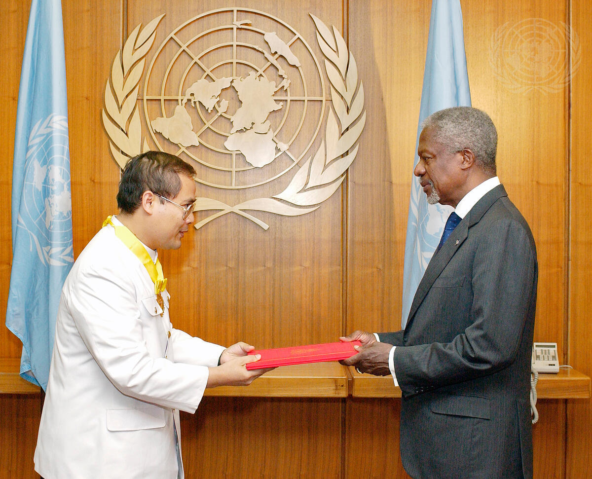 Chem Widyha (left), the new Permanent Representative of the Kingdom of Cambodia to the United Nations, presents his credentials to Secretary-General Kofi Annan.