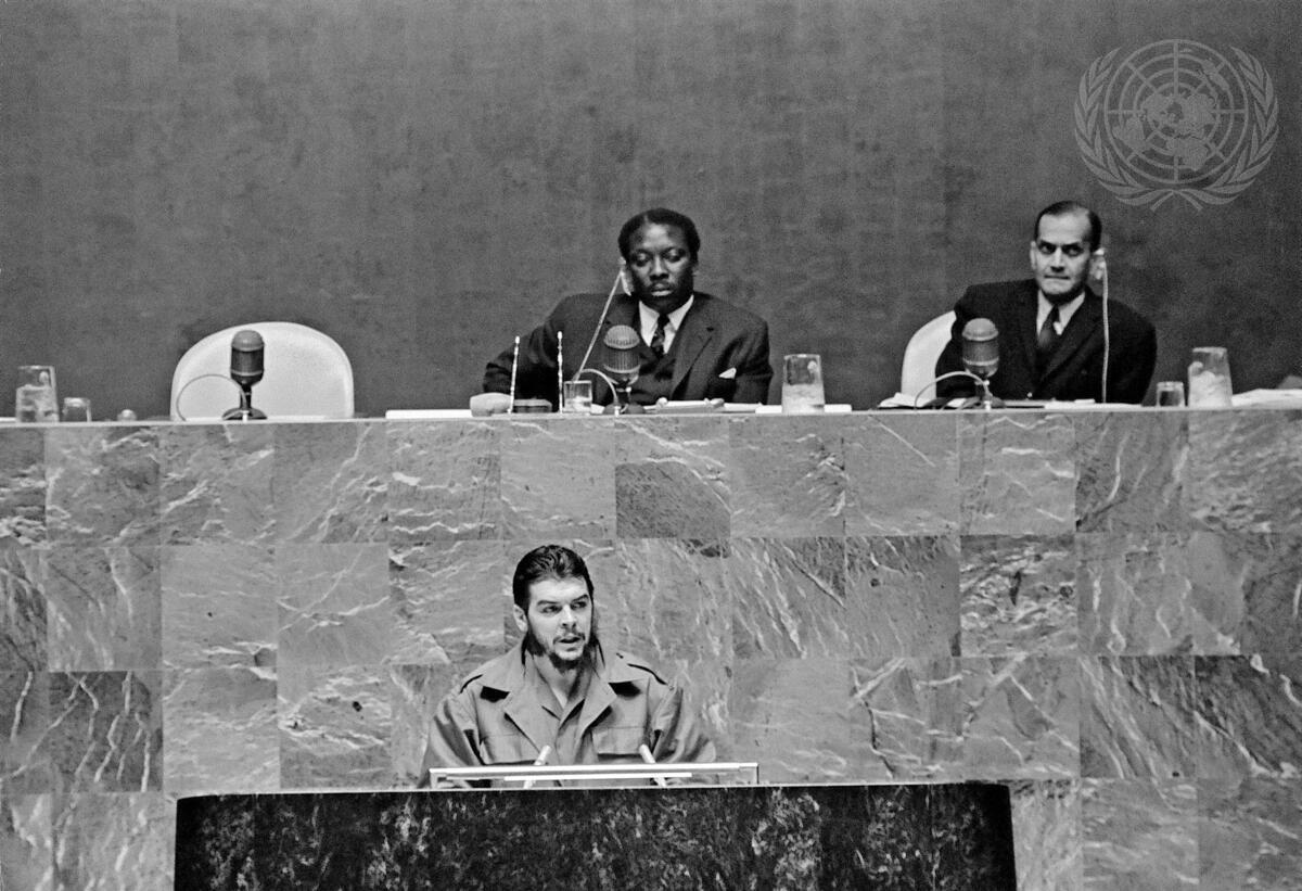 Mr. Ernesto Guevara (at speakers rostrum), Minister of Industries of Cuba, is seen addressing the Assembly. At the presidential rostrum are Mr. Alex Quaison-Sackey (left) of Ghana, Asssembly President, and Mr. G.V. Narasimhan, Under-Secretary for General Assembly Affairs and Chef de Cabinet.