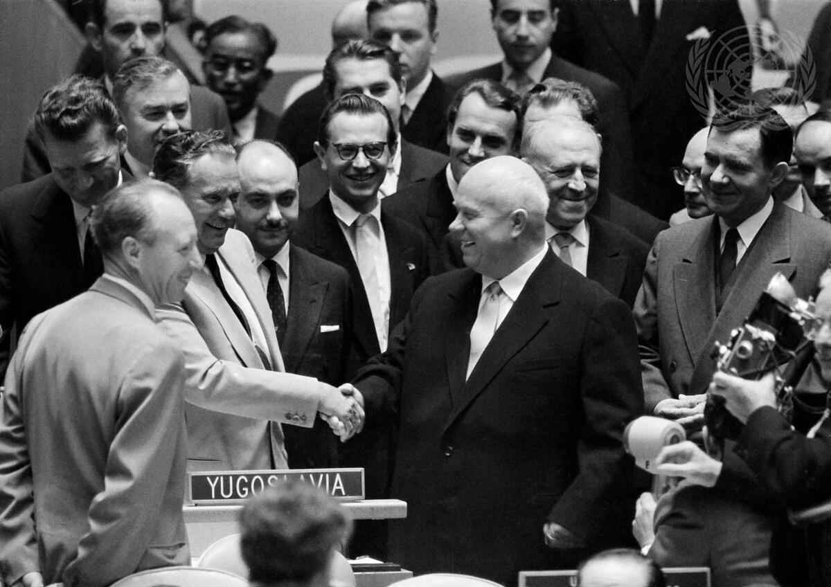 Shaking hands in greeting in the Assembly Hall before this morning's meeting, are Marshal Josip Broz-Tito (left), President of the Federal People's Republic of Yugoslavia; and Mr. N.S. Khrushchev, Chairman of the Council of Ministers of the USSR. Standing behind Mr. Khrushchev (from the right) are: Mr. A. A. Gromyko, USSR Minister for Foreign Affairs; and Mr. V.A. Zorin, Deputy Minister for Foreign Affairs of the USSR.