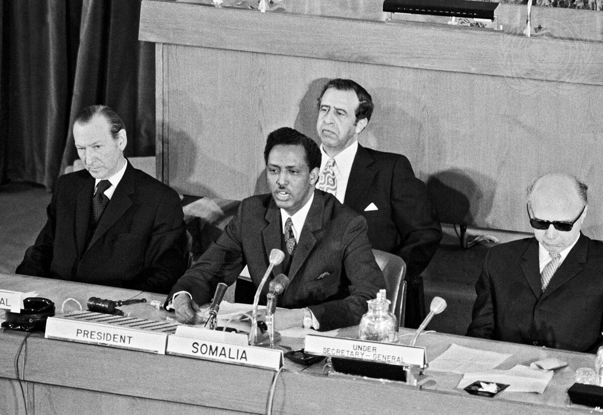 Omar Arteh GHALIB, (centre) Secretary of State for Foreign Affairs of Somalia, and President of the Council, making a statement as the Council began the first of its meetings in Africa. At left is Secretary-General Kurt; WADHEIM. At right is Leonid KUTAKOV, Under-Secretary-General for Political and Security Council Affairs. Seated behind Mr. Ghalib is Abdulrahim Abby FARAH, Permanent Representative of Somalia to the U.N.