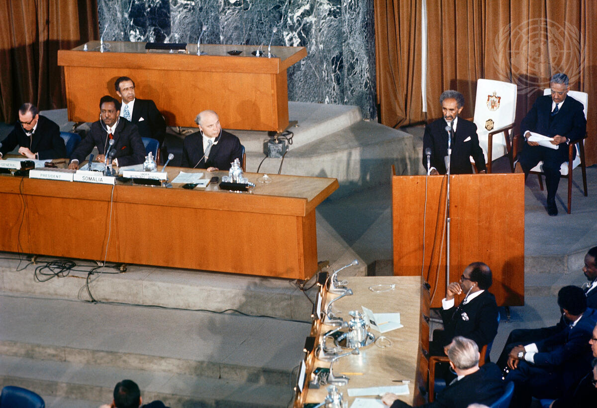 Partial view of the Council during address by Emperor Haile SELASSIE of Ethiopia. Seated on the podium, left to right: Secretary-General Kurt WALDHEIM; Omar Arteh GHALIB (Somalia), presiding; and Under-Secretary-General Leonid KUTAKOV, PSCA. At extreme right is President Ould DADDAH of Mauritania, current Chairman of the Assembly of Heads of State and Government of the OAU.