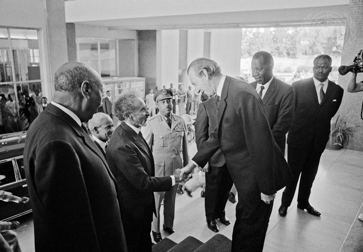 Emperor Haile Selassie of Ethiopia being greeted by Secretary-General Kurt Waldheim as he arrived to attend the opening meeting of the Security Council.