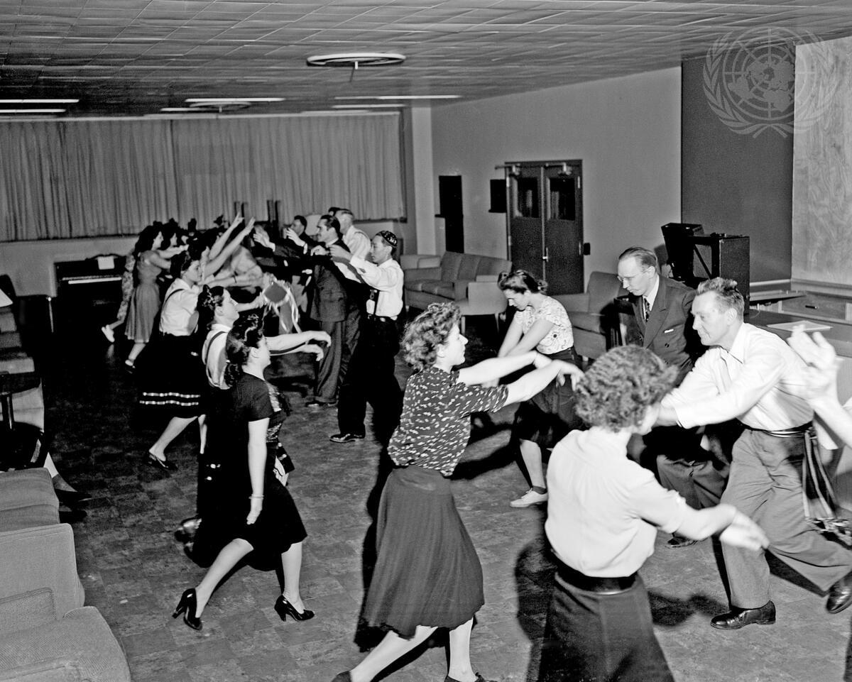 UN Secretariat members are shown during a folk dance rehearsal at the Secretariat lounge.