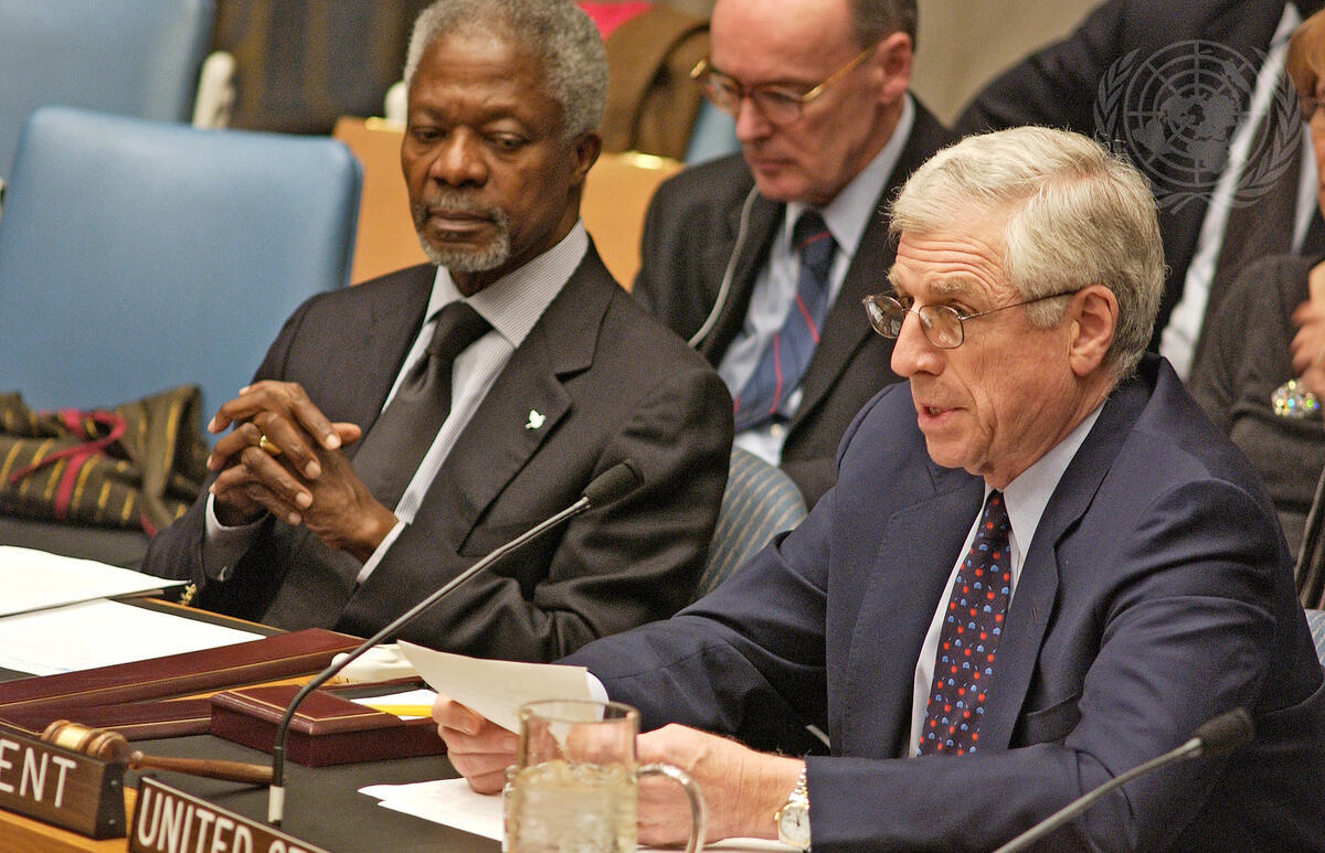 John C. Danforth (right), President of the Security Council for the month of November 2004 and Permanent Representative of the United States to the United Nation, reads the presidential statement of the Security Council on the situation in Cote D'Ivoire. Secretary-General Kofi Annan looks on.