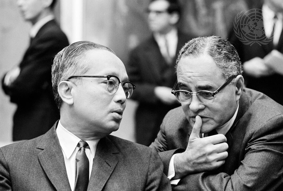 Secretary-General U Thant (left) conferring with Mr. Ralph J. Bunche, UN Under-Secretary for Special Political Affairs.