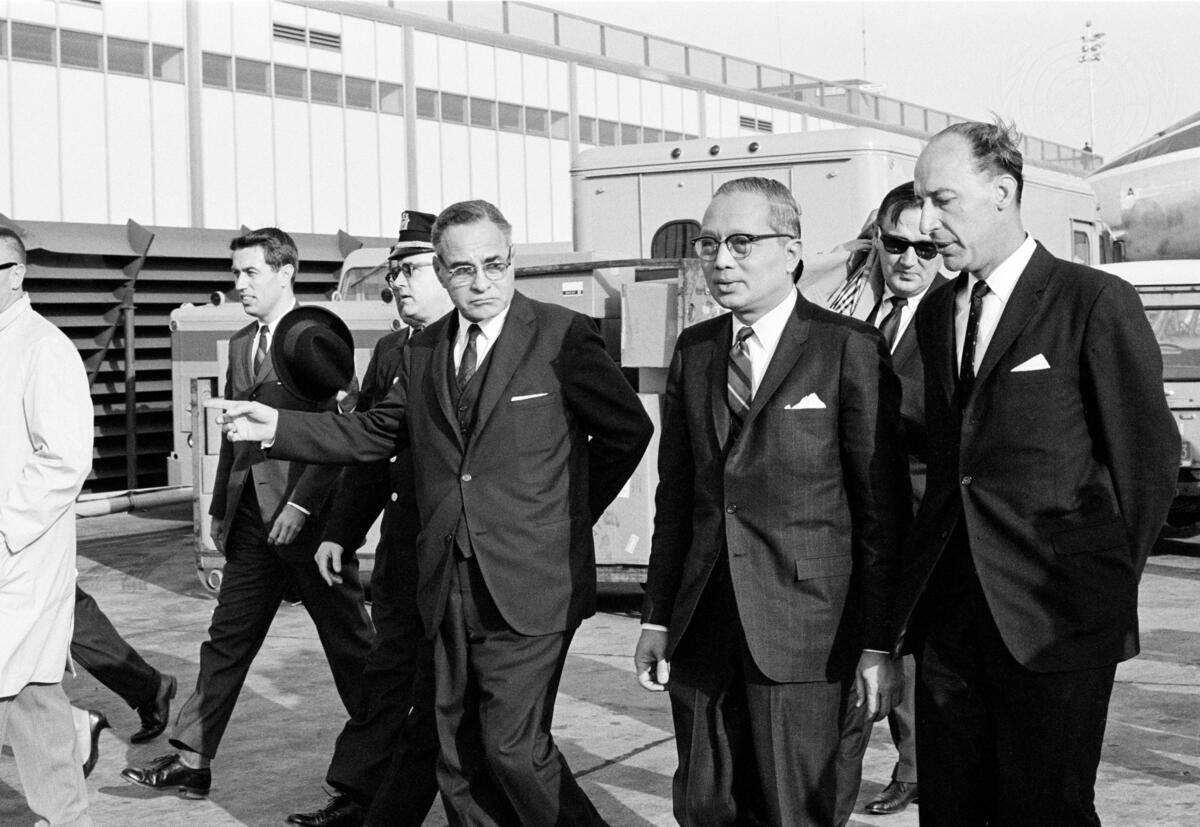 Secretary-General U Thant is seen at Kennedy International Airport upon his return from a visit to London, Paris, Strasbourg and Geneva. With him are Under-Secretaries for Special Political Affairs, Ralph J. Bunche (left) and Jose Rolz-Bennett (right).