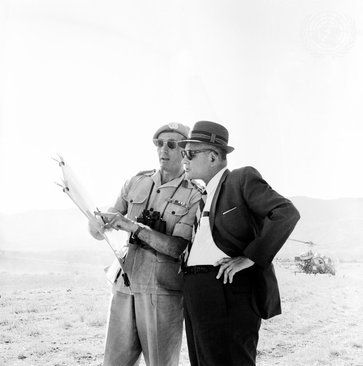 Mr. Bunche is shown (right) during his visit to the village of Trypimeni, east of Nicosia, as he is being briefed by Brigadier M. N. Harbottle, OBE, Chief of Staff of UNFICYP.