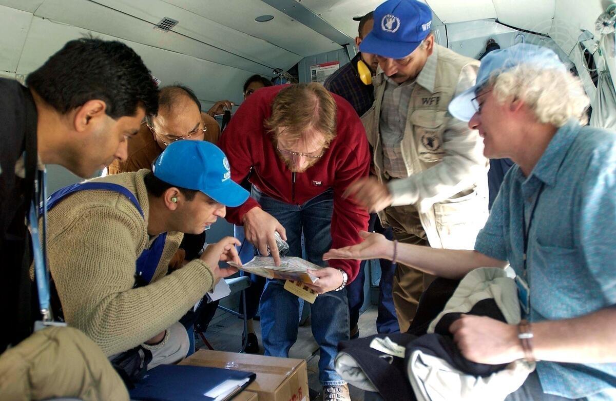 A United Nations Assessment Team, including representatives of the World Health Organization (WHO), UN Security and World Food Program (WFP), discuss plans before landing in Shardi, Pakistan, today.