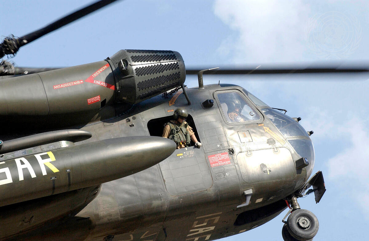 A German helicopter landing at the Muzaffarabad landing field to bring in much needed relief to the area, destroyed during the October 8 earthquake that hit northern Pakistan.