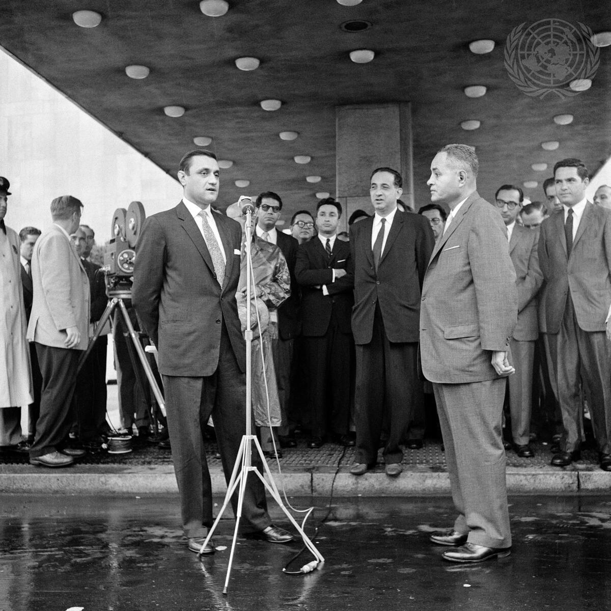 The new flag of Iraq was raised at United Nations Headquarters today, on the occasion of the first anniversary of the Iraqi revolution. Seen here addressing the gathering shortly before the flag was raised is Dr. Adnan Pachachi (left.), Acting Permanent representative of Iraq to the United Nations. At right is Dr. Ralph Bunche.