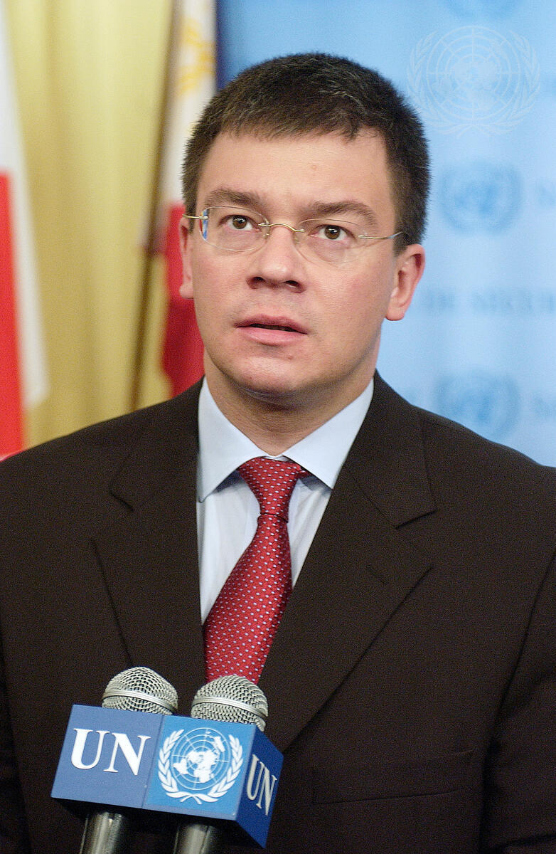 Mihai Rãzvan Ungureanu, Foreign Minister of Romania, the country that holds the presidency of the Security Council for the month of October, briefs correspondents on the situation in Syria before a Council meeting, today at UN Headquarters.