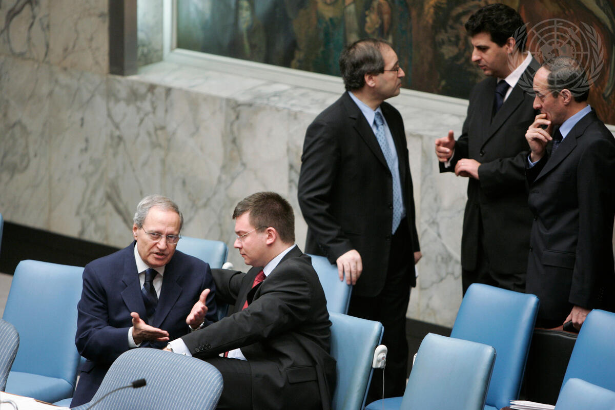 Farouk Al-Shara? (left, seated), Minister for Foreign Affairs of the Syrian Arab Republic, talks to Mihai Rãzvan Ungureanu, Minister for Foreign Affairs of Romania, just before the Security Council's unanimous adoption of resolution 1636 (2005), today at UN Headquarters. The resolution calls on Syria to detain Syrian suspects identified by the UN International Independent Investigation Commission into the assassination of former Lebanese Prime Minister Rafik Hariri or face ""further action"" if it does not comply,