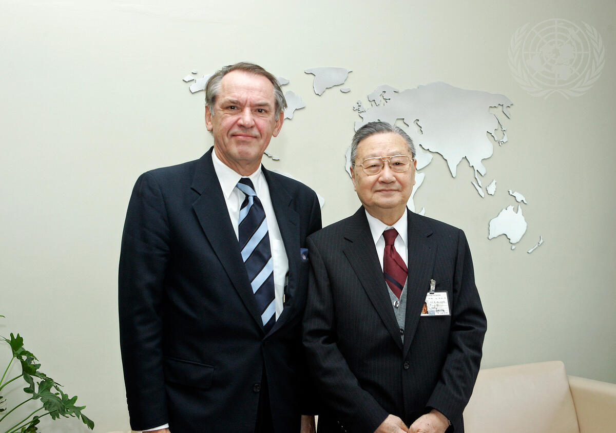 Shi Jiuyong (right), President of the International Court of Justice (ICJ), and Jan Eliasson, President of the sixtieth session of the General Assembly, pictured when the two met, today at UN Headquarters.