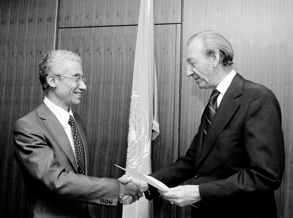 Mahmoud Aboul-Nasr (left), the new Permanent Representative of Oman to the United Nations, is seen presenting his credentials to Secretary-General Kurt Waldheim at United Nations headquarters today. Mr. Aboul-Nasr, prior to his appointment, was Director of the International Organization Department in the Egyptian Ministry for Foreign Affairs.