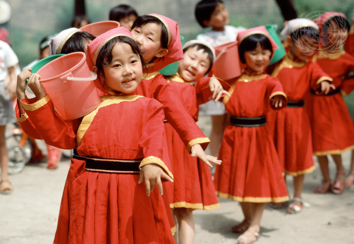Children participating in a pre-census demonstration in Hohhot [Inner Mongolia]. Various forms of skits and performances were used to explain the purpose and the procedures of the census to the population. [c. 1982]