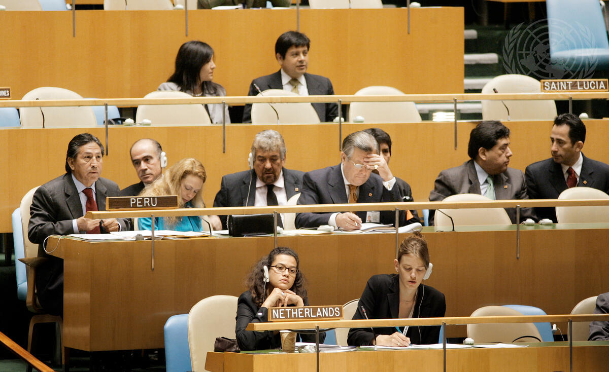The delegation of Peru, headed by President Alejandro Toledo Manrique (behind nameplate), at the sixtieth session of the General Assembly. The annual general debate of the United Nations General Assembly takes place over a 10-day period beginning on 17 September 2005, focusing on the follow-up to the World Summit.
