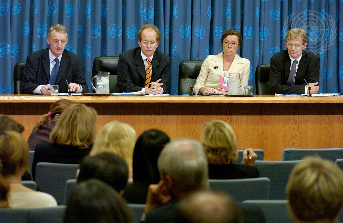Jan Egeland (right), Under-Secretary-General for Humanitarian Affairs and Emergency Relief Coordinator, along with (left to right) Hilary Benn, Secretary of State for International Development of the United Kingdom; Jean-Louis Schlitz, Minister of Cooperation and Humanitarian Action of Luxembourg; and Annika Soder, State Secretary for International Development Cooperation of the Ministry of Foreign Affairs of Sweden, brief journalists on ""Humanitarian Reform and the Central Emergency Response Fund"", today at UN Headquarters.