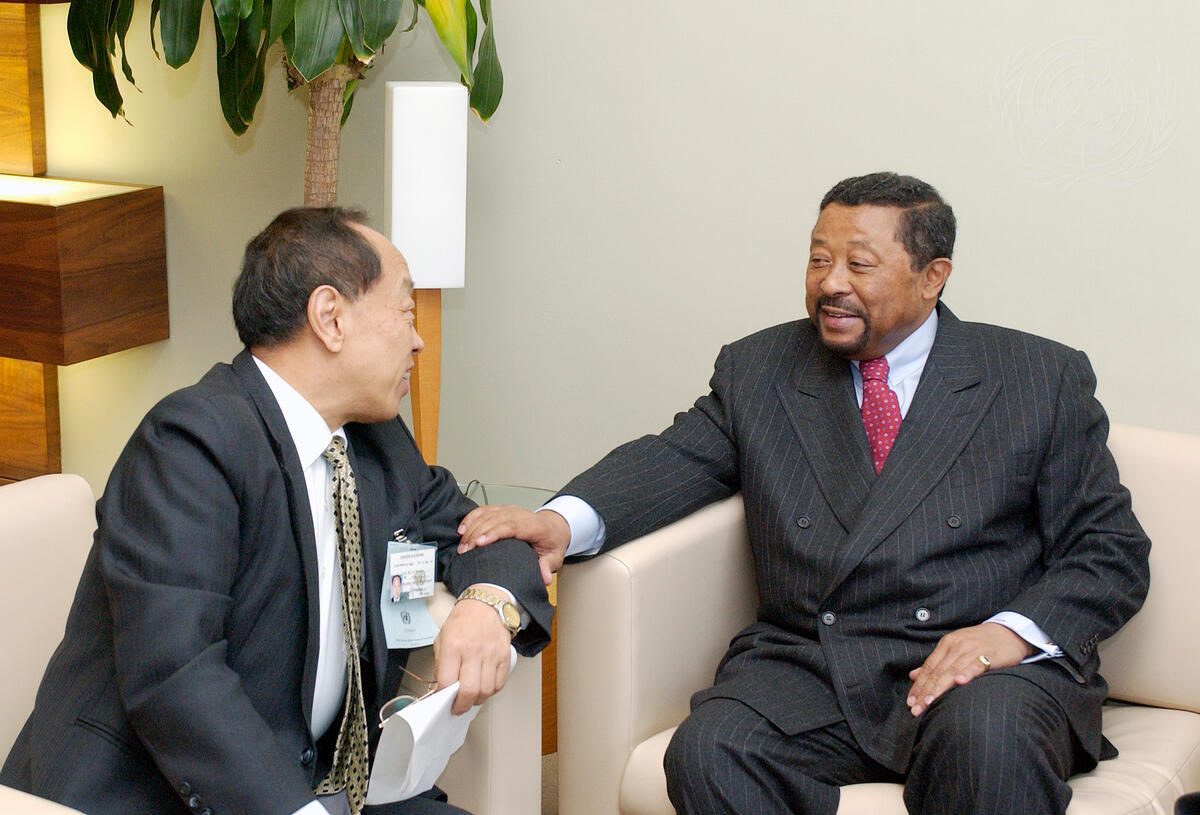Jean Ping (right), President of the fifty-ninth session of the General Assembly, meets with Li Zhaoxing, Minister for Foreign Affairs of the People's Repubilc of China.