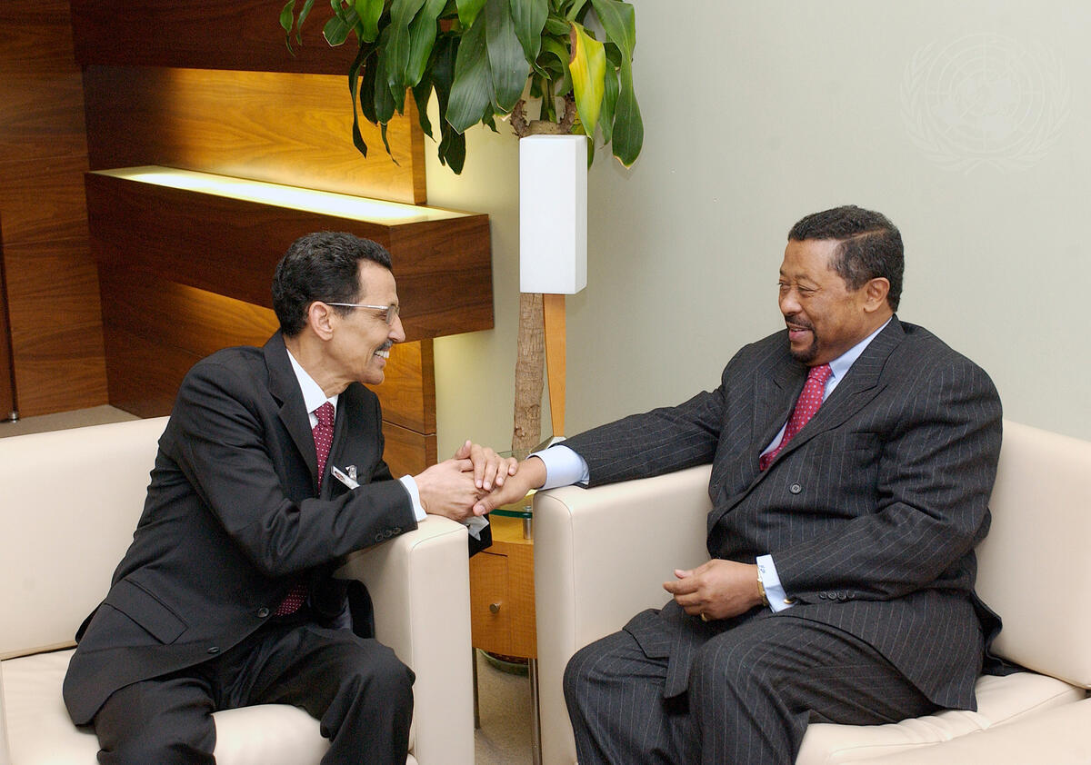 Jean Ping (right), President of the fifty-ninth session of the General Assembly, meets with Mohamed Vall Ould Bellal, Minister for Foreign Affairs of the Islamic Republic of Mauritania.