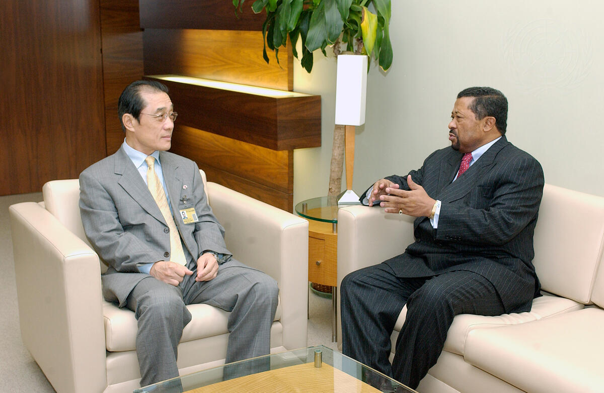 Jean Ping (right), President of the fifty-ninth session of the General Assembly, meets with Choe Su Hon, Deputy Minister for Foreign Affairs of the Democratic People's Republic of Korea,.