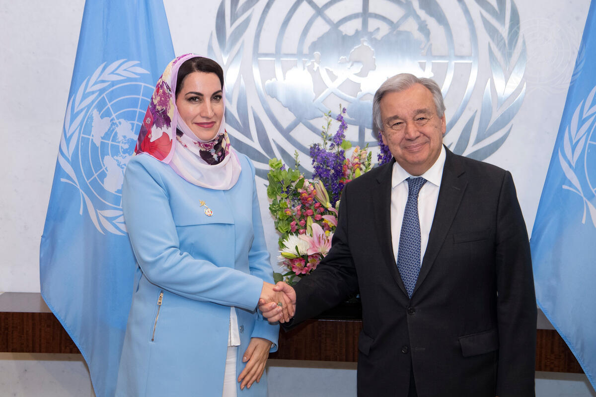 Caption Description Secretary-General António Guterres (right) meets with Her Highness Sayyida Dr. Mona Fahad Mahmood Al-Said, Assistant Vice-Chancellor of International Cooperation at Sultan Qaboos University and Chairperson of Children First Association.