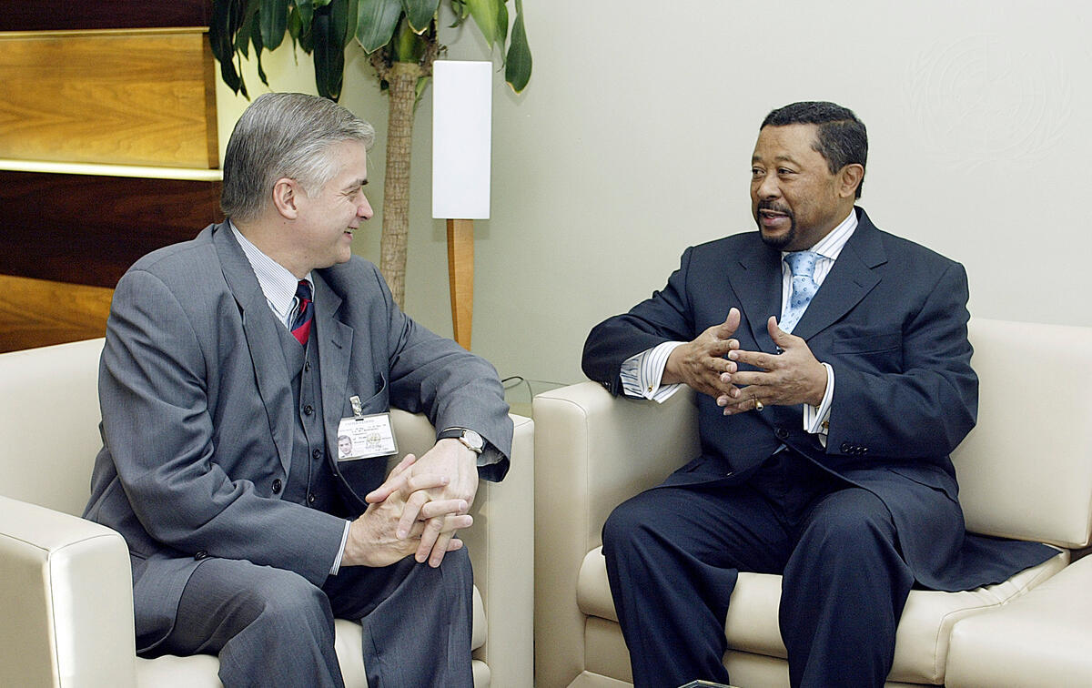 Jean Ping (right), President of the fifty-ninth session of the General Assembly, meets with Wlodzimierz Cimoszewicz, Minister for Foreign Affairs of Poland.