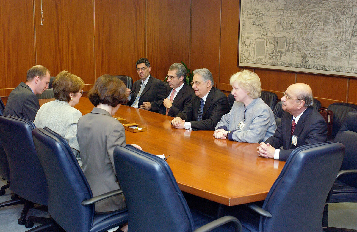 Deputy Secretary-General Louise Fréchette (second from left, facing away from camera) meets with Fernando Henrique Cardoso (fourth from left, facing camera), Co-Chairman of the Club of Madrid, and other Members of the Club of Madrid.