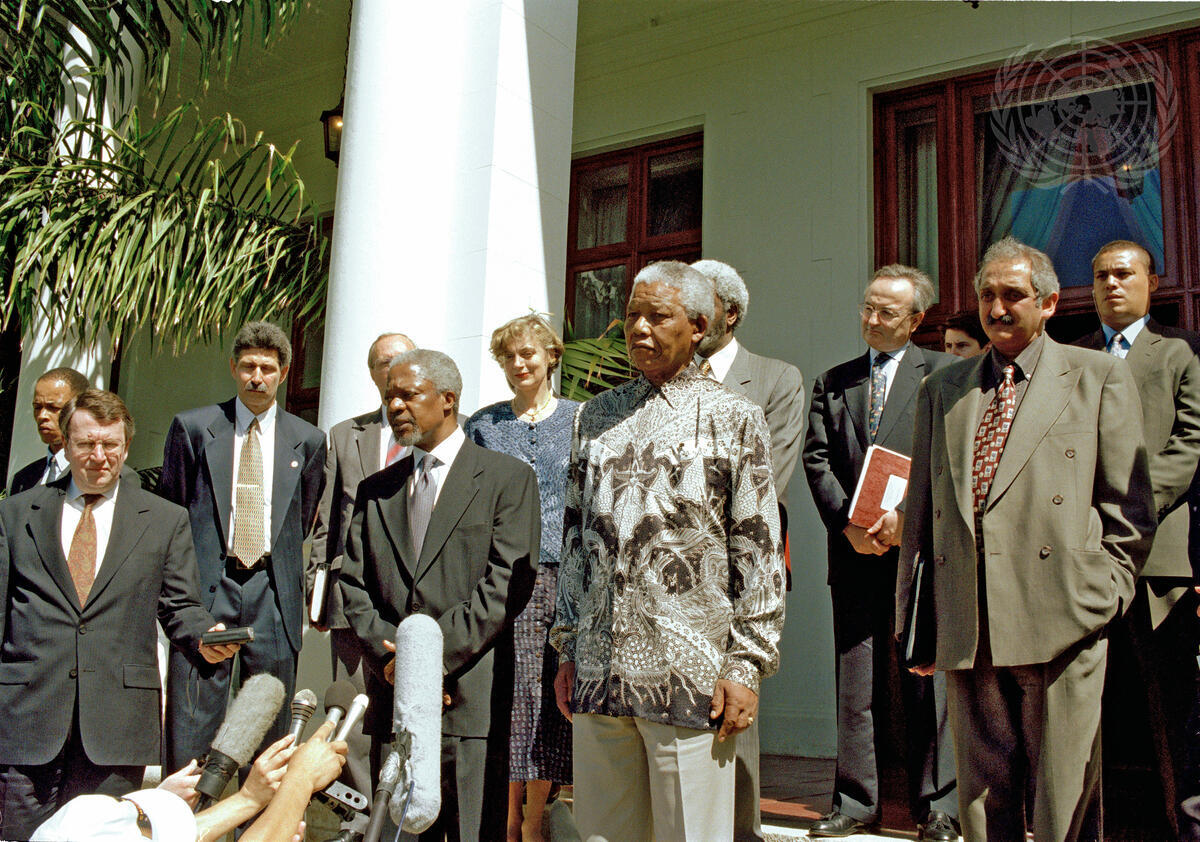 Secretary-General Kofi Annan (left, behind microphones), on a nine-day trip to South Africa, Namibia, Angola and Togo, meets with Nelson Mandela (centre), President of South Africa. Right, front is Aziz Pahad, Deputy Minister of Foreign Affairs of South Africa. Mrs. Nane Annan is standing in the background between the Secretary-General and President Mandela.
