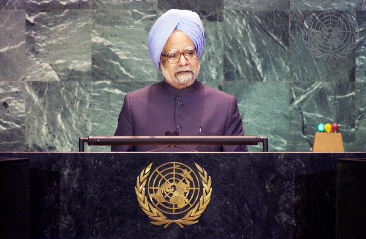 Caption Description Manmohan Singh, Prime Minister of India, addressing the General Assembly.