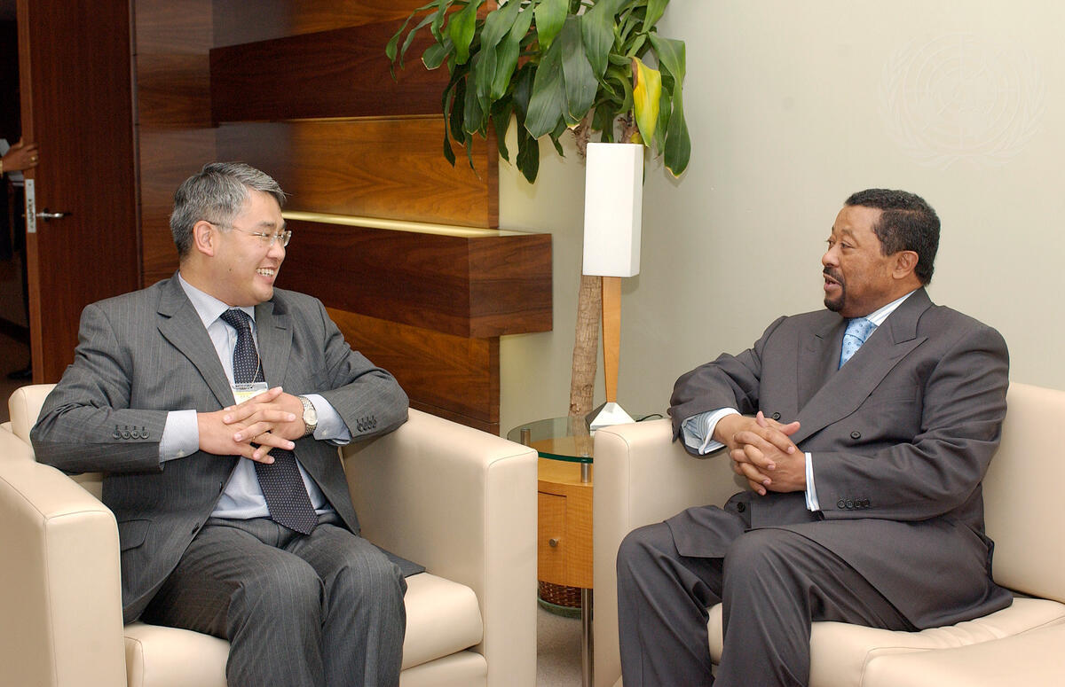Jean Ping (right), President of the fifty-ninth session of the General Assembly, meets with Radnaabazaryn Altangerel, Chairman of the Delegation of Mongolia.