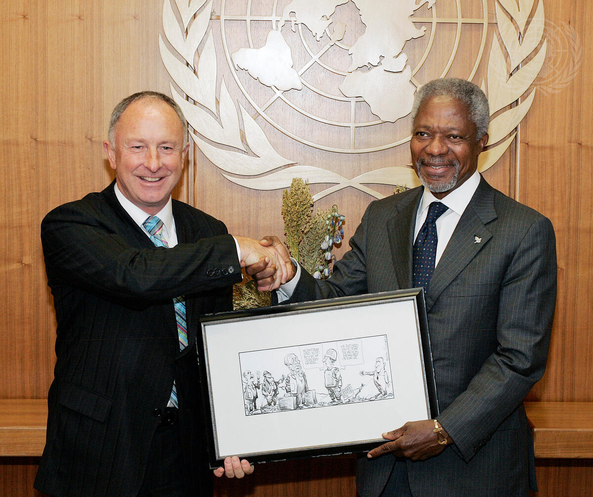 Secretary-General Kofi Annan (right) receives a gift from Dermot Ahern, T.D., Foreign Minister of Ireland, who called on Mr. Annan, at UN Headquarters in New York.