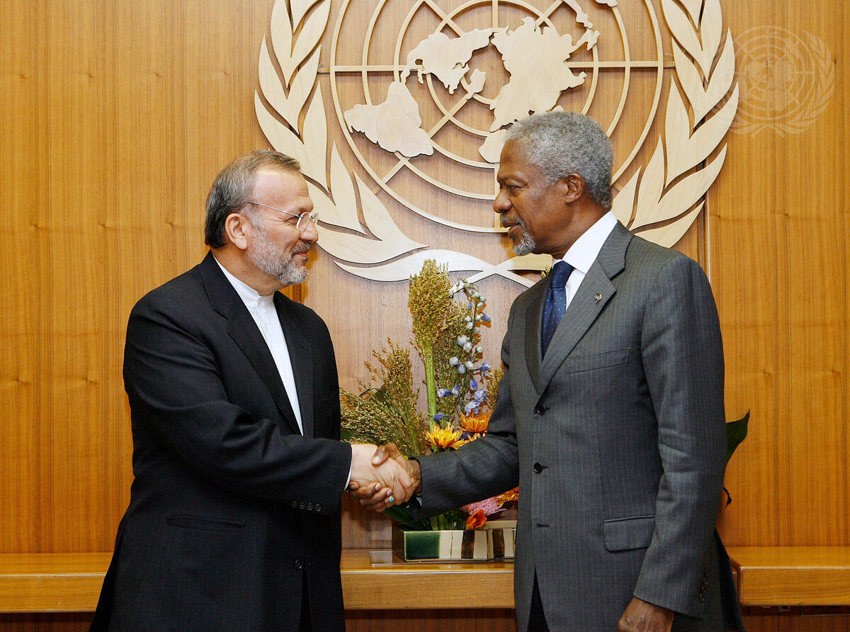 Secretary-General Kofi Annan (right) meets with Manouchehr Motaki, Foreign Minister of Iran, at UN Headquarters in New York.