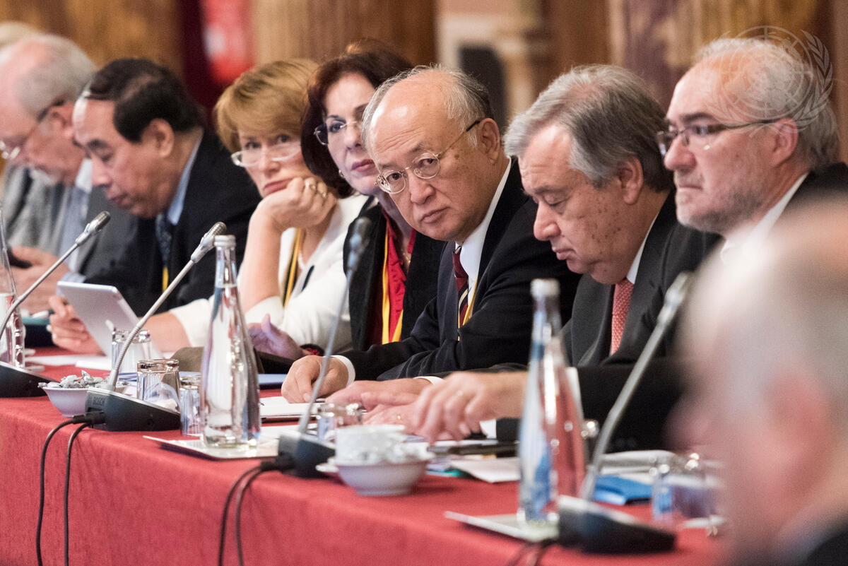 Participants of the two-day session of the UN Chief Executives Board (CEB), taking place in Paris, including Yukiya Amano (third from right), Director-General of the International Atomic Energy Agency (IAEA); and António Guterres (second from right), UN High Commissioner for Refugees (UNHCR).