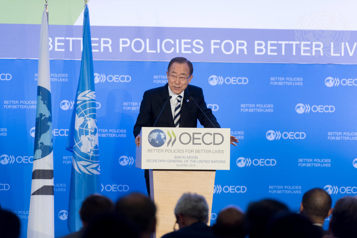 Secretary-General Ban Ki-moon delivers a keynote address to Ambassadors and staff of the Organisation for Economic Co-operation and Development (OECD) at OECD headquarters in Paris.