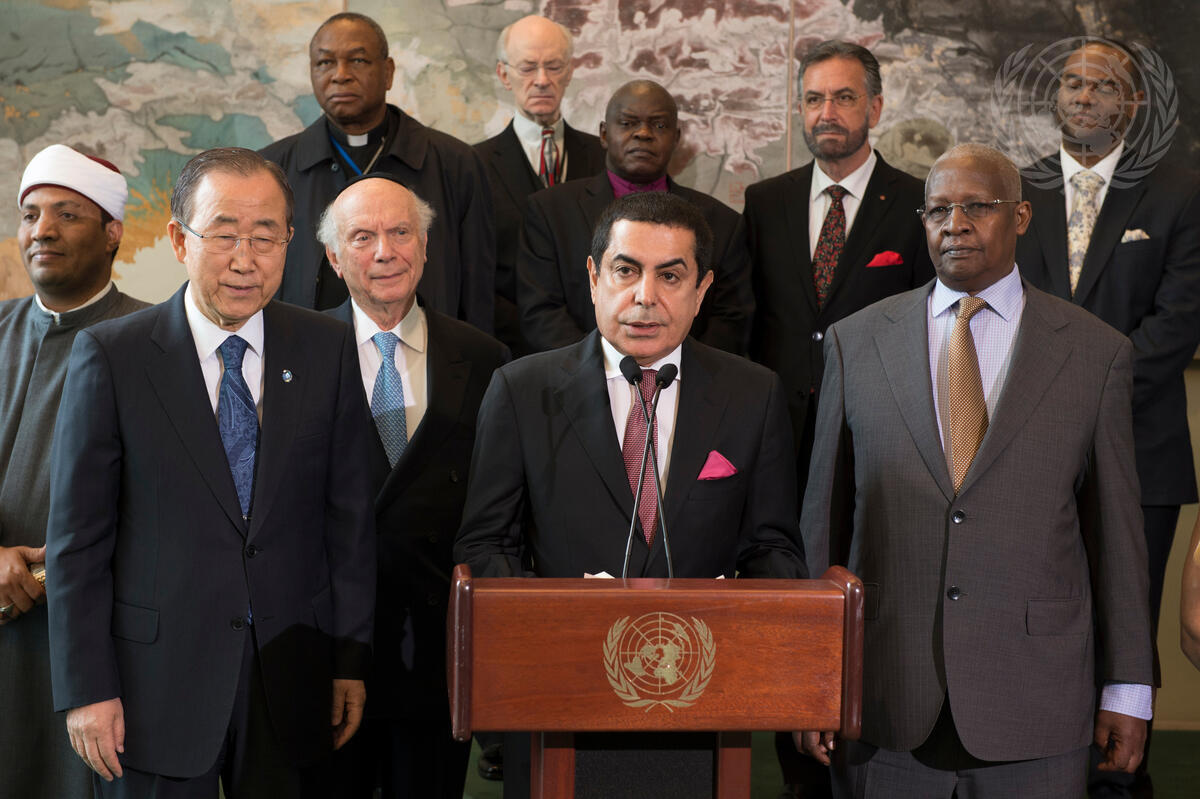Nassir Abdulaziz Al-Nasser (centre), UN High Representative for the Alliance of Civilizations, flanked by Secretary-General Ban Ki-moon (left), and General Assembly President Sam Kutesa, addresses journalists on the Assembly’s high-level debate on the theme, ""Promoting Tolerance and Reconciliation: Fostering Peaceful, Inclusive Societies and Countering Violent Extremism"".