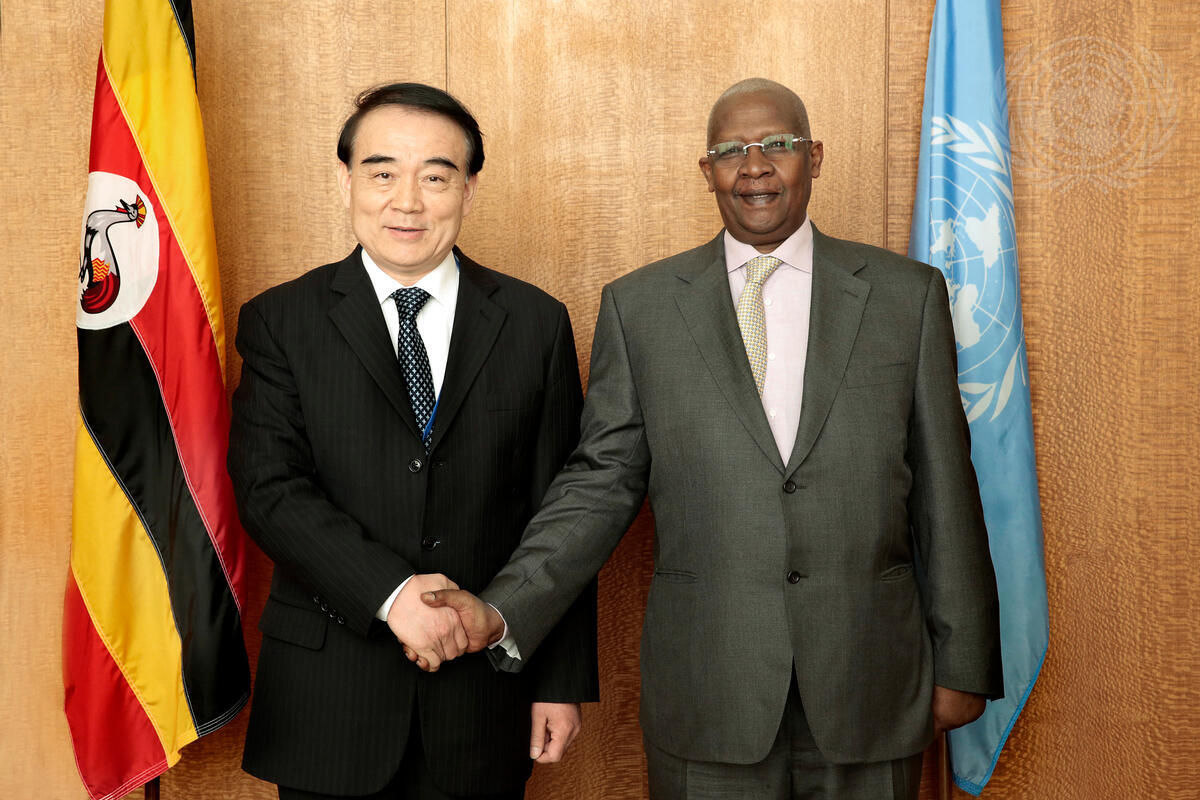 Sam Kutesa (right), President of the sixty-ninth session of the General Assembly, meets with Li Baodong, Vice Foreign Minister of the People’s Republic of China.