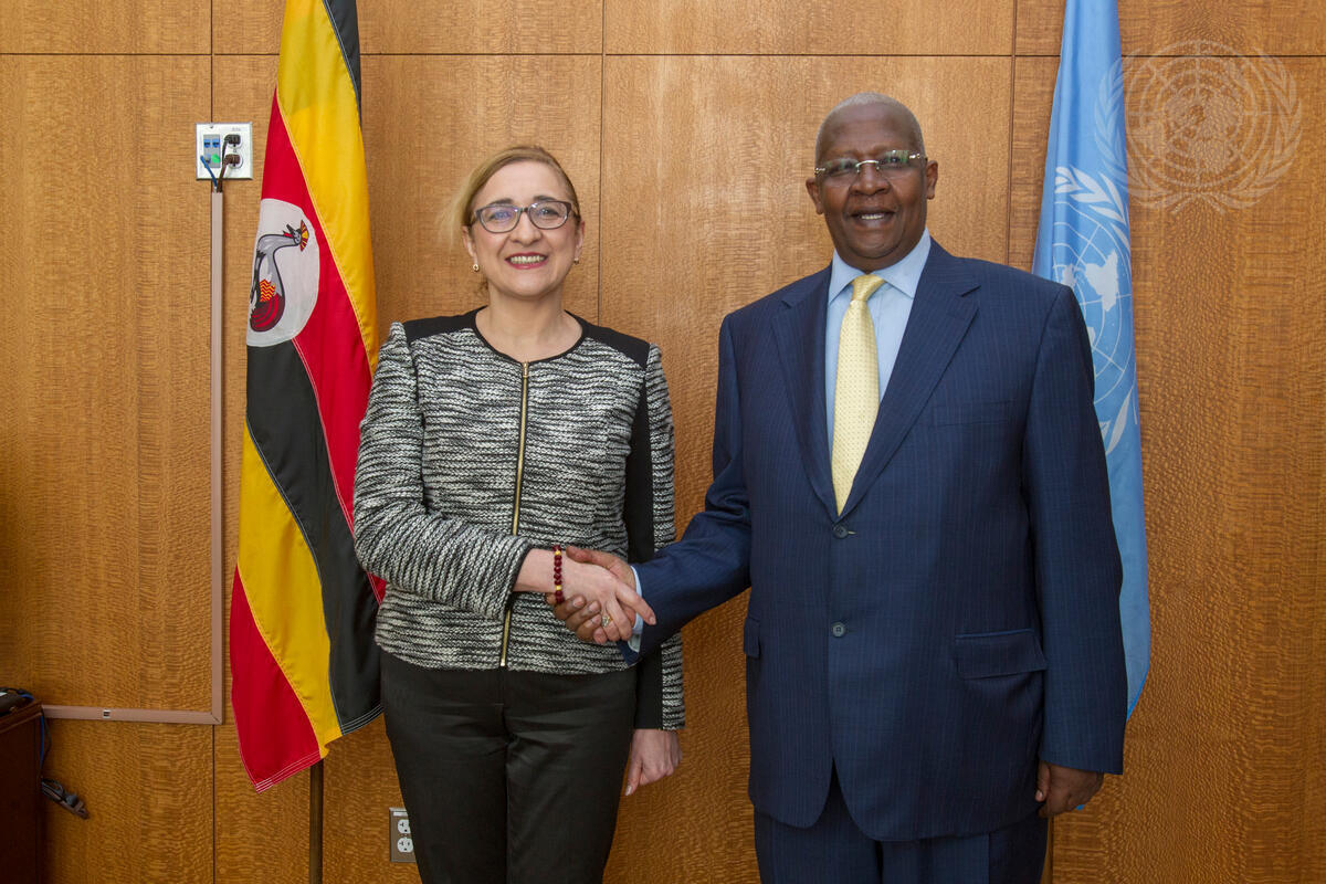 Sam Kutesa (right), President of the sixty-ninth session of the General Assembly, meets with Tamar Beruchashvili, Minister for Foreign Affairs of Georgia