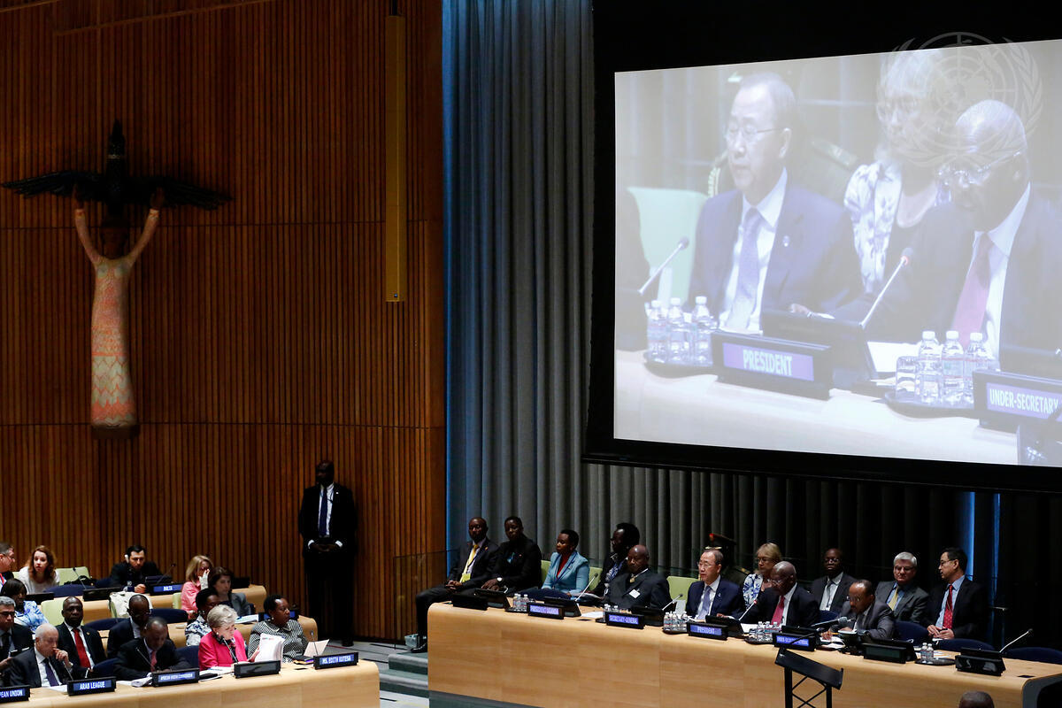 A view of the Trusteeship Council Chamber as Sam Kutesa (right on screen), President of the sixty-ninth session of the General Assembly, addresses the opening segment of the Assembly’s high-level thematic debate on ""Strengthening Cooperation between the United Nations and Regional and Sub-regional Organizations"". Pictured with him on the dais (from left): Yoweri Kaguta Museveni, President of the Republic of Uganda; Secretary-General Ban Ki-moon; and Tegegnework Gettu, Under-Secretary-General for General Assembly and Conference Management.